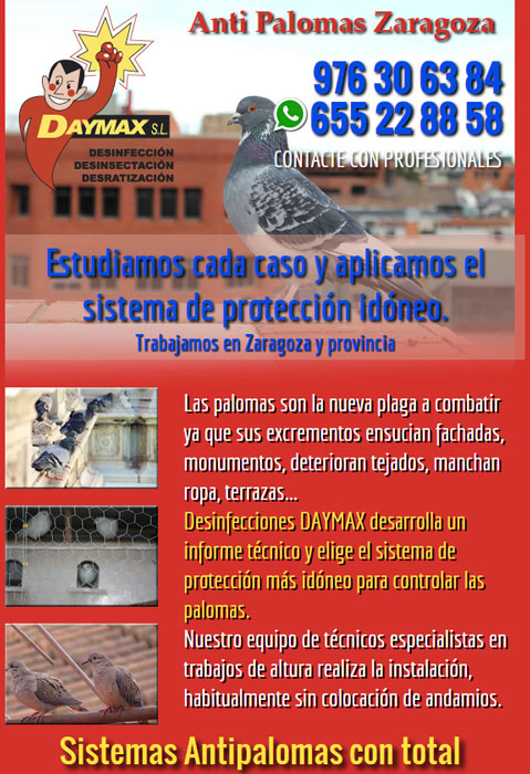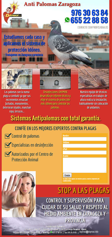Landing page adaptada a móviles creada para promocionar el servicio anti palomas en Zaragoza de la empresa DayMax (Zaragoza).