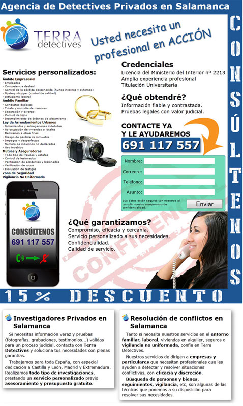 Landing Page creada para la campaña de publicidad online en Google AdWords, para la Agencia Terra Detectives (Salamanca).