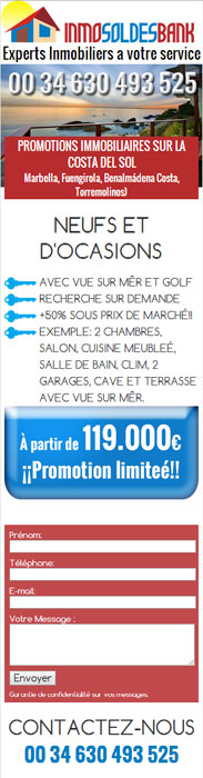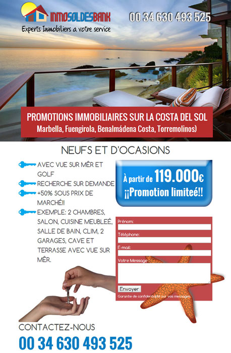 Landing page con diseño respondivo, adaptada a cualquier dispositivo. Promoción inmobiliaria de InmoSoldesBank (Málaga) para el mercado de habla francesa.