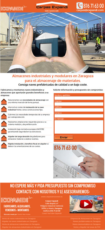 Micrositio de 9 páginas para la empresa de Almacenes Zaragoza, que vende y alquila naves industriales para almacenaje.