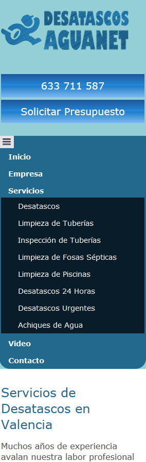 Sitio web de la empresa de desatascos Aguanet (Valencia), dedicada a trabajos de pocería, localización de arquetas, inspección de tuberías con cámaras de TV, etc. Adaptado a dispositivos: Página de video en tableta. En smartphone.