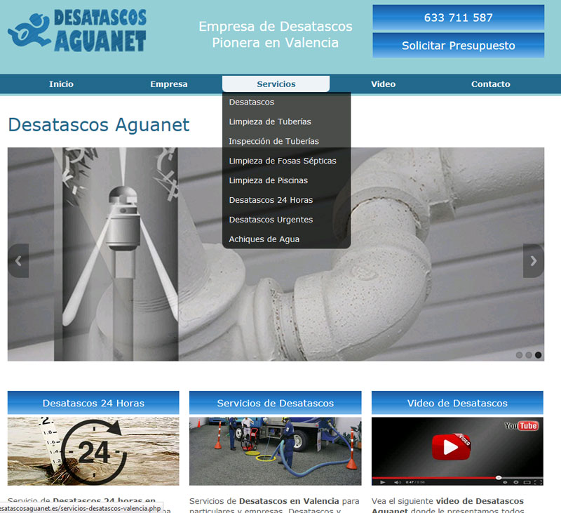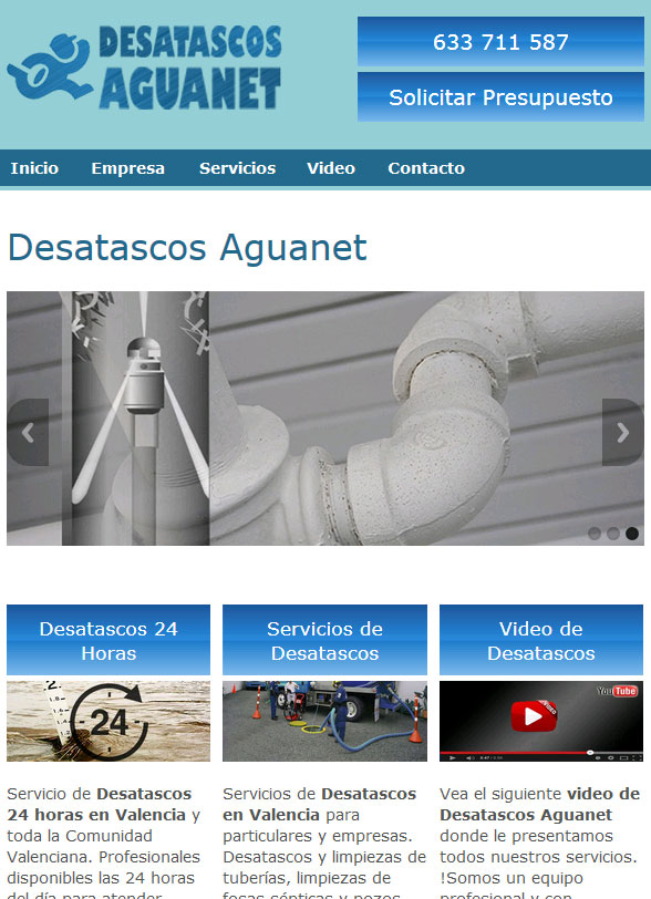 Micrositio para la empresa Desatascos Aguanet (Valencia). Un diseño alternativo de micrositio, con slide en portada, módulos de servicios, menús desplegables, nuevo menú para móviles, botones con degradado, etc.