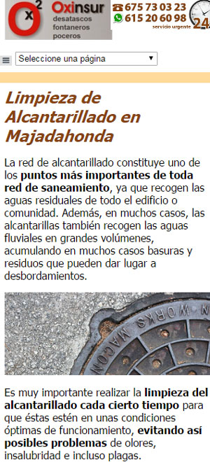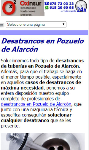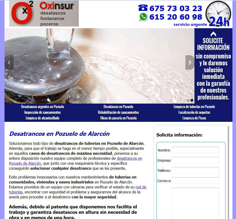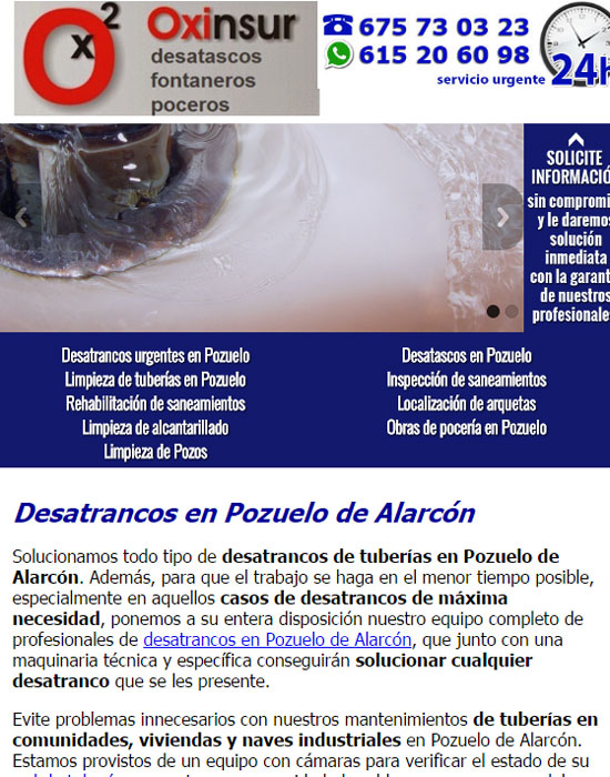 Micrositio adaptado a móviles y tabletas diseñado para la empresa Oxinsur, de Desatrancos en Pozuelo de Alarcón (Madrid), que realiza desatascos, limpieza de tuberías, desagues, alcantarillado, y pozos ciegos, etc. en toda la comunidad de Madrid.