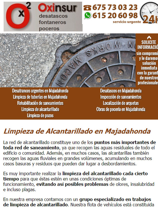 Micrositio para la empresa Desatascos Oxinsur en Majadahonda (Madrid), dedicada a Desatrancos, inspección de saneamientos, localización de arquetas....