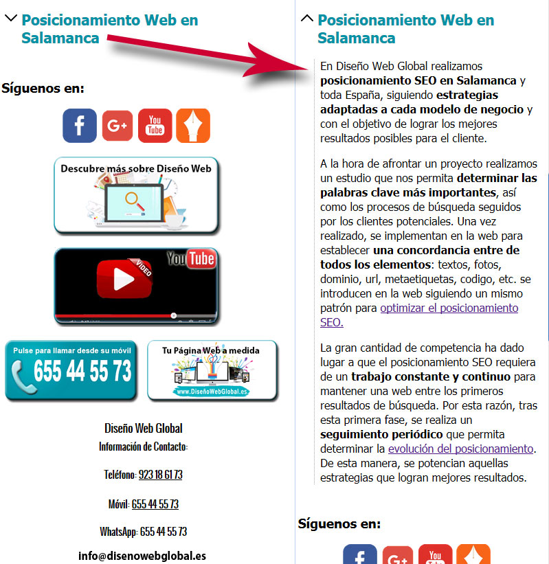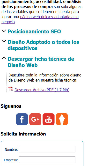 Con apartados desplegables para lectura más cómoda en móviles. Página en tabletas, en móviles.