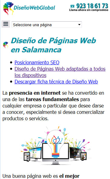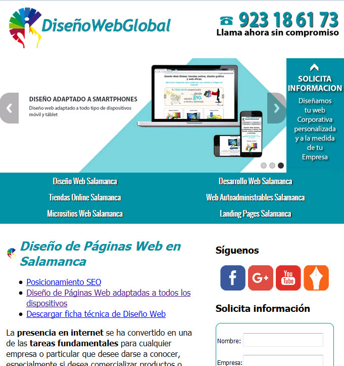 Micrositio para Diseño Web Global, sobre Diseño web en Salamanca, tiendas online, desarrollo de aplicaciones web, landing pages, páginas web auto administrables, etc.