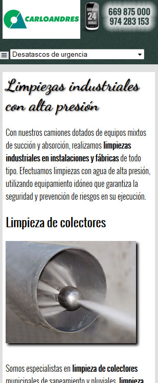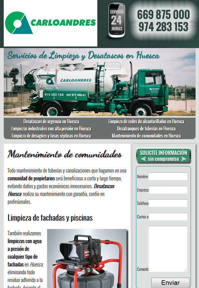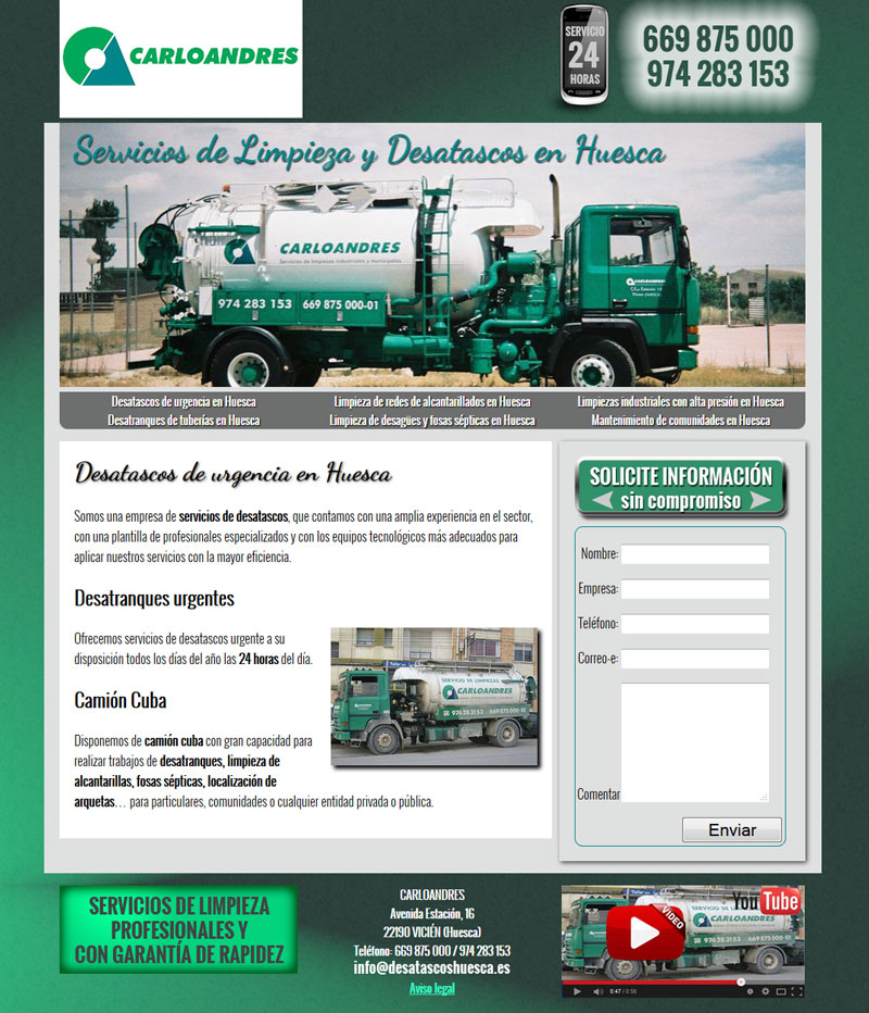 Micrositio web de 7 páginas para la empresa Desatascos Huesca CarloAndrés (Huesca). dedicada a desatranques y fontanería de redes de alcantarillado. Con video corporativo y