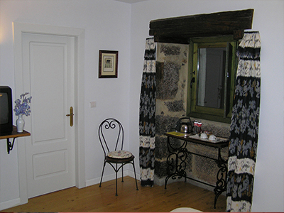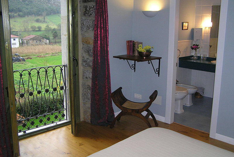 La habitación ocre. Está orientada a dos fachadas. Al Este, la fachada principal, posee una pequeña terraza plena de geranios con una inscripción en piedra del año de construcción de la casona (1871) desde la que se divisa el valle y la ermita de la Virgen de Palacios. Al Norte tiene bonitas vistas a la montaña.