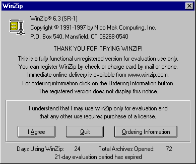 | Entonces aparecerá la pantalla que nos recuerda que éste programa es shareware y que nuestro derecho de evaluación del producto sólo dura 21 días, y que transcurrido dicho plazo debemos comprarlo o eliminarlo de nuestro disco duro. | |